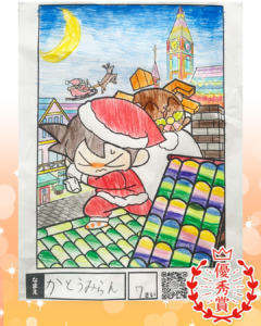 サンタさんの“おはな”の色が、いっしょうけんめいにプレゼントをかついでいる感じがして、すごく伝わってきました。